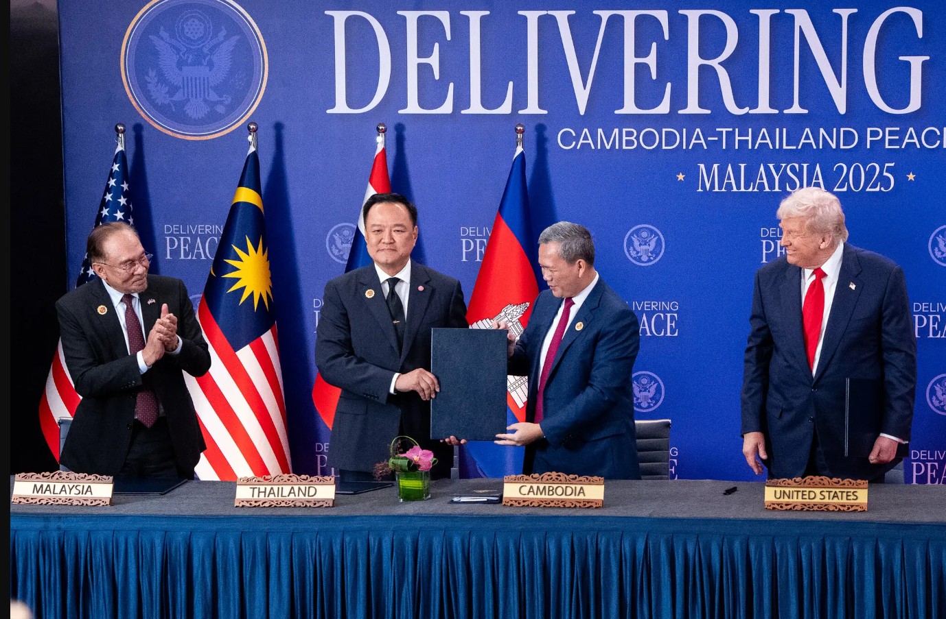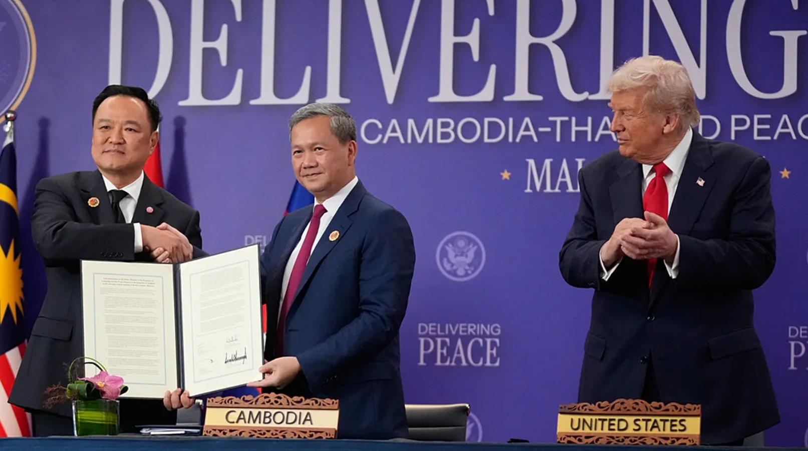 အမေရိကန်သမ္မတ ဒေါ်နယ်ထရမ့်၊ မလေးရှားဝန်ကြီးချုပ် အန်ဝါတို့ ရှေ့မှာ ထိုင်း-ကမ္ဘောဒီးယား အပစ်ရပ် သဘောတူညီကြစဉ်