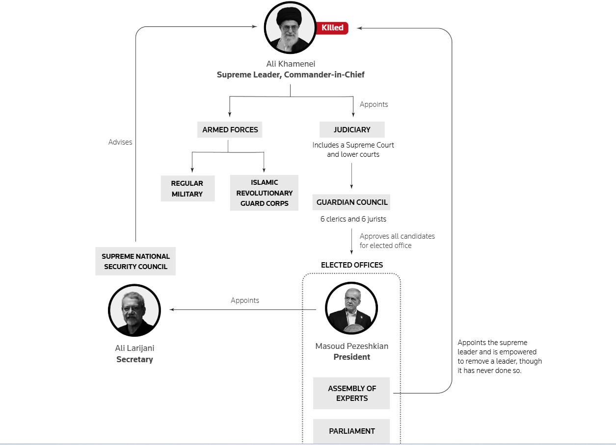 အီရန်သမ္မတ မာဆွတ် ပီဇက်ရှ်ကီယန် (Masoud Pezeshkian) ကမူ ၎င်းနှင့် တရားစီရင်ရေးဌာန အကြီးအကဲ၊ သြဇာ ကြီးမားသော အုပ်ထိန်းသူကောင်စီ (Guardian Council) မှ အဖွဲ့ဝင်တစ်ဦးတို့ ပါဝင်သည့် ဦးဆောင်မှု ကောင်စီ (Leadership Council) သည် အမြင့်ဆုံးခေါင်းဆောင် ခါမေနီ၏ တာဝန်များကို ယာယီလွှဲပြောင်း ရယူထားကြောင်း ပြောကြားခဲ့သည်။
