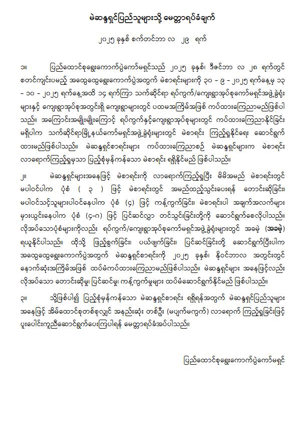 The Union Election Commission (UEC) has announced that for the upcoming general election to be held on December 28, 2025, the voter lists will be posted publicly for the first time from September 30 to October 13, at the respective ward/village-tract sub-commission offices and villages within the village tracts.