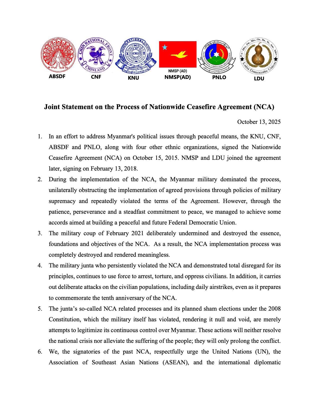 Some Ethnic Armed Organizations (EAOs) jointly issued a statement on October 13, 2025, urging representatives from the United Nations (UN), the Association of Southeast Asian Nations (ASEAN), and the international community not to attend the 10th Anniversary Ceremony of the Nationwide Ceasefire Agreement (NCA).