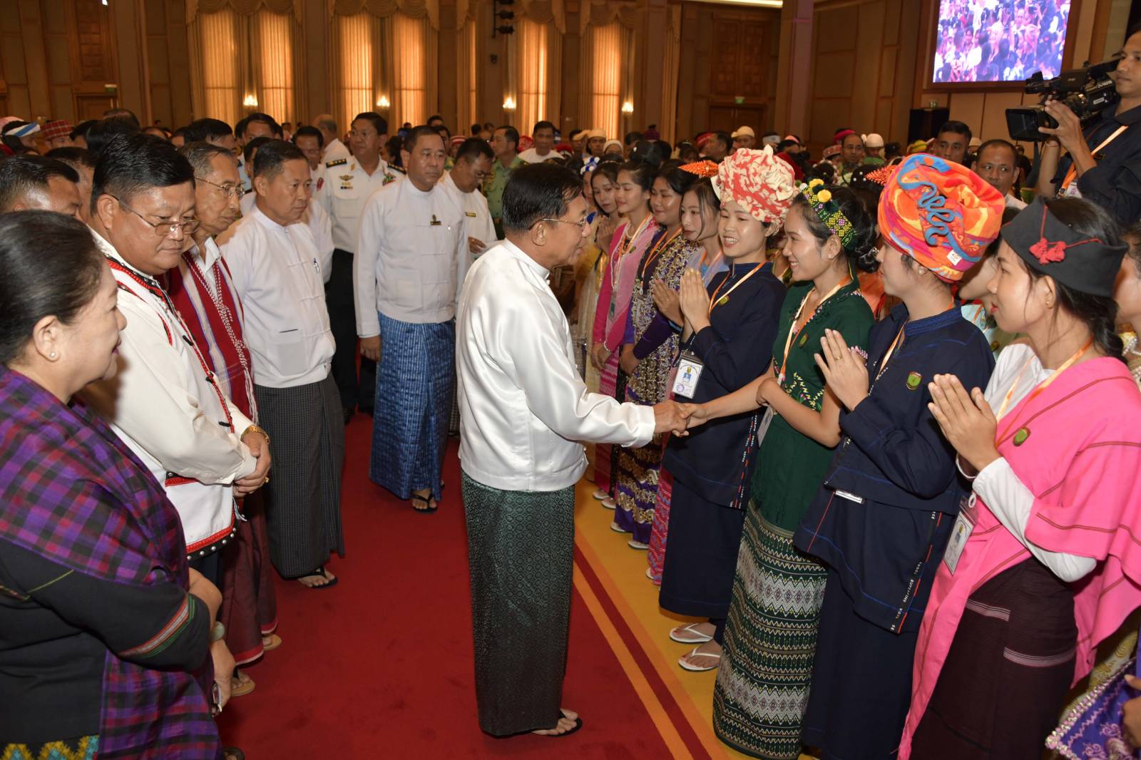 Senior General Min Aung Hlaing seen with youths from various ethnic groups