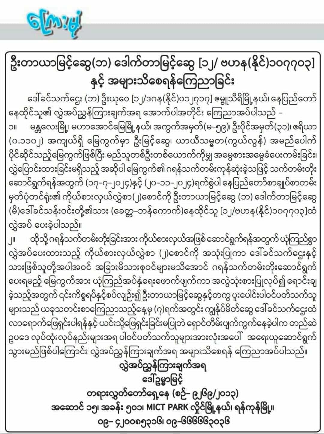 It is stated that Daw Khin Thet Htay, their son, and other family members had no knowledge of the sale. In relation to this matter, U Tar Yar Myint Swe and any individuals involved were instructed to come forward and resolve the issue within seven days from the date of the newspaper announcement. Failure to do so and evading responsibility would result in legal action against all parties involved, in accordance with existing laws.