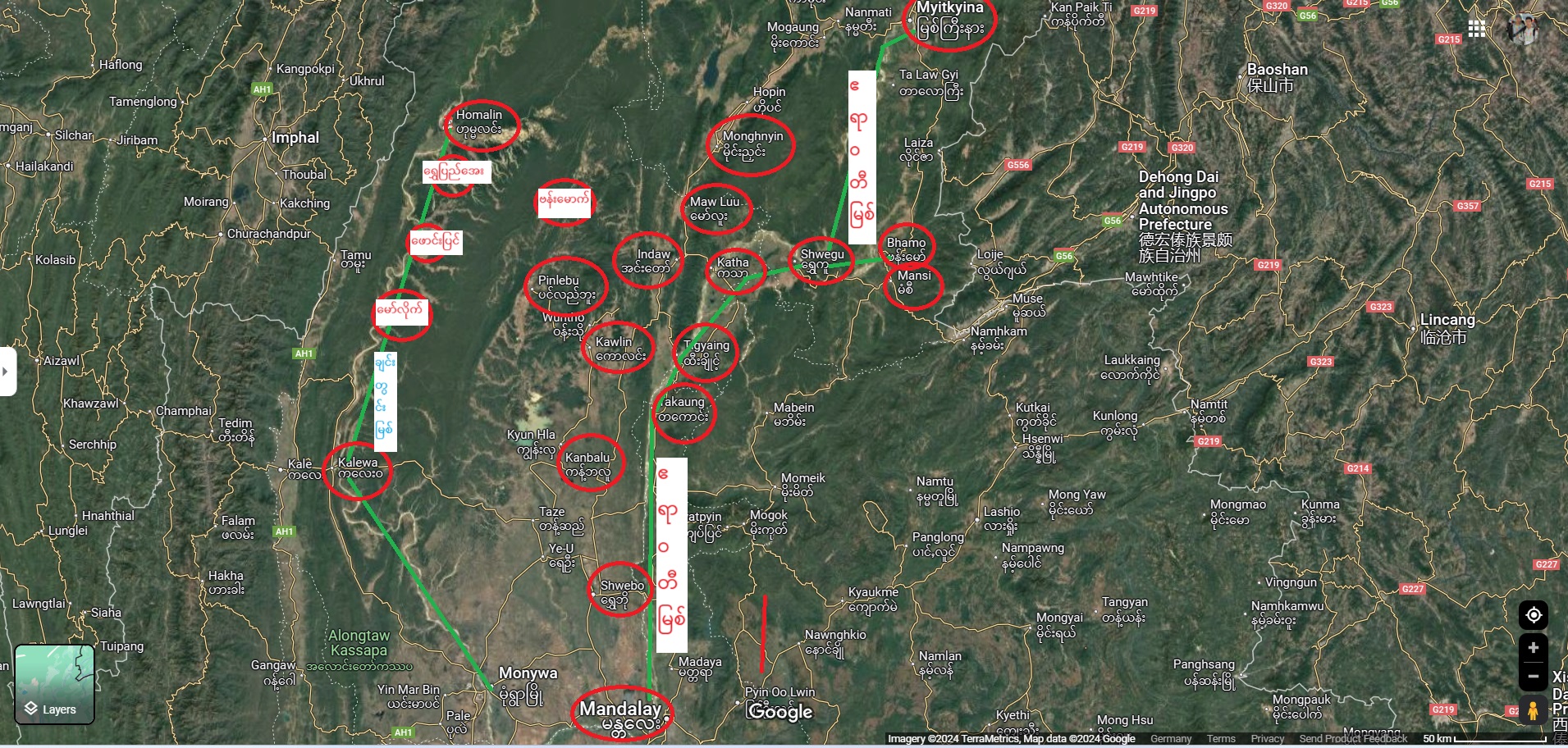 စစ်ကိုင်းတိုင်းမှ ကချင်-ရခိုင်-ချင်းကို ဆက်စပ်ထားပုံကို တွေ့ရစဉ်