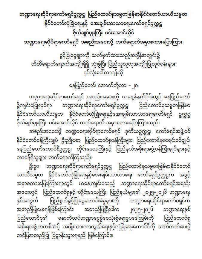 အလားတူ ခွင့်ပြုငွေများကို သတ်မှတ်ထားသည့် အချိန်အတွင်း၌ ထိထိရောက်ရောက် အကျိုးရှိရှိ သုံးစွဲပြီး ပြည်သူလူထု အကျိုးပြုလုပ်ငန်းများ ရုပ်လုံးပေါ်လာရန်လိုကြောင်း၊ ပြည်ထောင်စုဝန်ကြီးများနှင့် တိုင်းဒေသကြီး နှင့် ပြည်နယ် ဝန်ကြီးချုပ်များ အနေဖြင့် ဘတ်ဂျက်ရငွေများကို အမှန်တကယ် ရရှိအောင်နှင့် သုံးငွေများကို အမှန် တကယ် အကျိုးရှိသည့် နေရာများတွင်သာ အသုံးပြုရန်လိုကြောင်း ၎င်းက ပြောသည်။