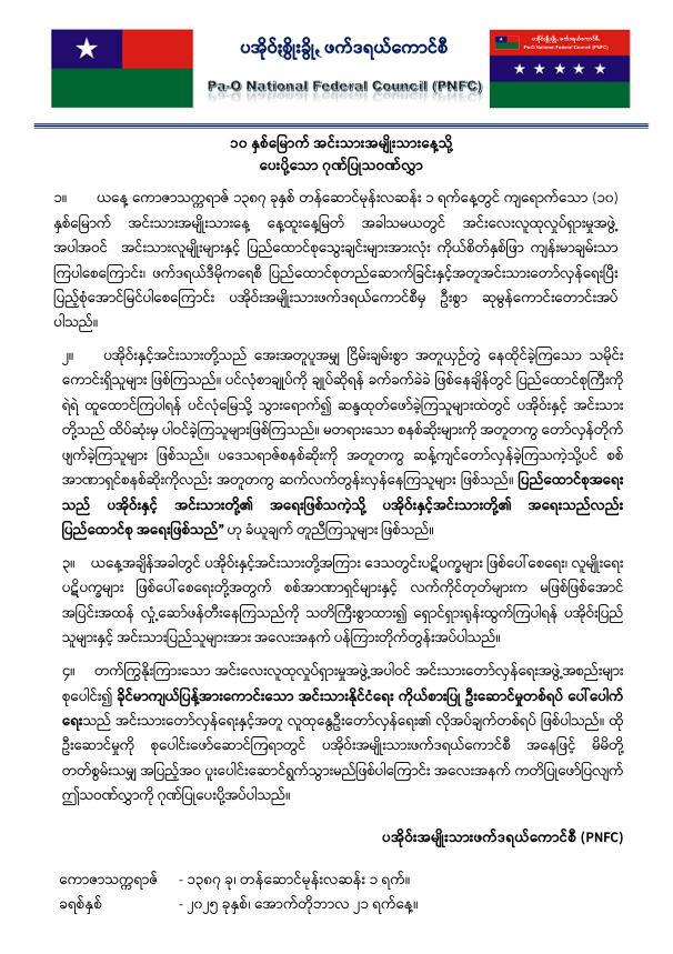 ထိုဦးဆောင်မှုကို စုပေါင်းဖော်ဆောင်ကြရာတွင် ပအိုဝ်းအမျိုးသားဖက်ဒရယ်ကောင်စီ အနေဖြင့် မိမိတတ်စွမ်းသမျှ အပြည့်အဝ ပူးပေါင်းဆောင်ရွက်သွားမည်ဟု PNFC က ပြောသည်။