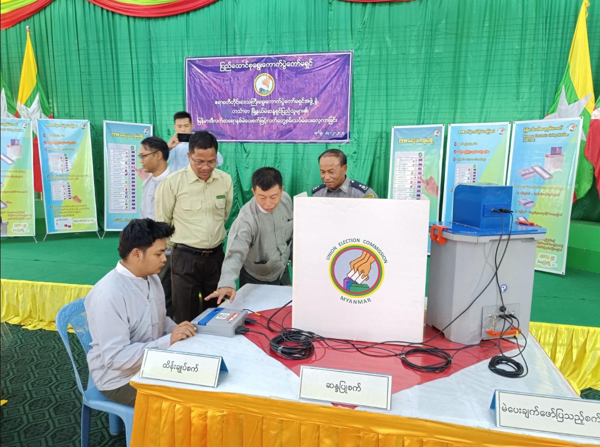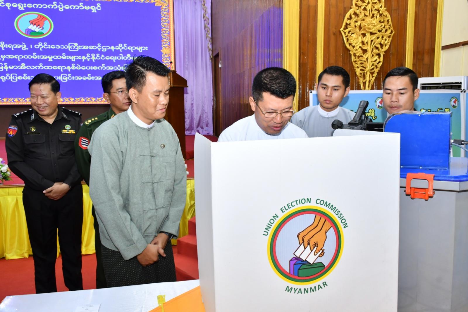 ဧရာဝတီတိုင်းဒေသကြီး အစိုးရအဖွဲ့ကို မဲပေးပုံ ပြသနေစဉ်
