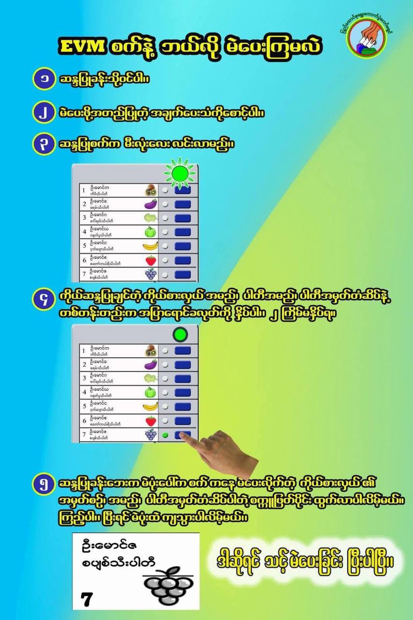 မဲပေးစက် ကိုင်တွယ် အသုံးပြုနည်း သင်တန်းများကို တိုင်းဒေသကြီး/ပြည်နယ်အလိုက် ဆောင်ရွက်လျက်ရှိ ကြောင်း၊ မဲဆန္ဒရှင်ပြည်သူများ၊ မဲပေးစက်ဖြင့် ကျွမ်းကျင်စွာ မဲပေးနိုင်ရန်အတွက် ရပ်ကွက်/ကျေးရွာ အုပ်စုအဆင့် ထိ သရုပ်ပြ လေ့ကျင့်သင်တန်းများ ဆောင်ရွက်နေကြောင်း၊ မီဒီယာကတစ်ဆင့် အသိပညာပေး အစီအစဉ်များ ထုတ်လွှင့် ပြသလျက်ရှိကြောင်း ပြည်ထောင်စုရွေးကောက်ပွဲကော်မရှင်(UEC)က CNI သတင်းဌာနသို့ ပြောသည်။