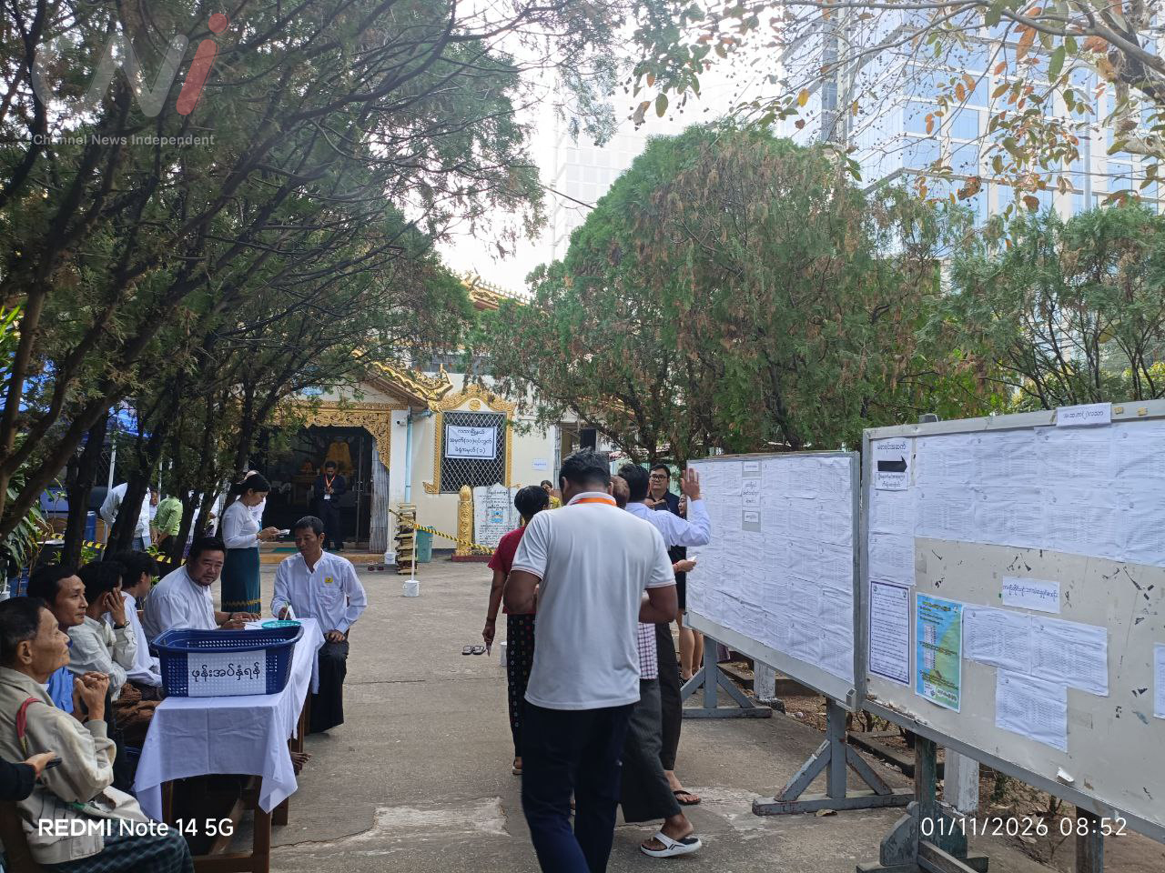 ရန်ကုန်တိုင်းဒေသကြီး၊ လသာမြို့နယ်၊ ၁၀ ရပ်ကွက်၊ အထက (၁) ကျောင်းအတွင်းရှိ မဲရုံအမှတ် (၁) တွင် မဲဆန္ဒရှင်ပြည်သူများ ၂၀၂၆ ခုနှစ်၊ ဇန်နဝါရီ ၁၁ ရက်က မဲလာပေးနေကြသည်။