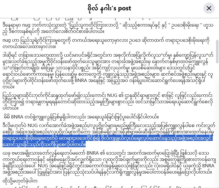 ထို့ပြင် NUG အနေဖြင့် ခရိုင်တွင်း အကောက်ခွန် မျှဝေသုံးစွဲခြင်း လုံးဝ မရှိပါလျှက်နှင့် ထိုသို့ BNRA အဖွဲ့အစည်း အပေါ် ပြုမူခြင်းသည် ပြန်လည်သုံးသပ်ရန် လိုအပ်ကြောင်း၊ ထိုကျူးလွန်မှုအပေါ် တာဝန်ခံပေးရန် လိုအပ်သည်ဟု ၎င်းက ပြောသည်။
