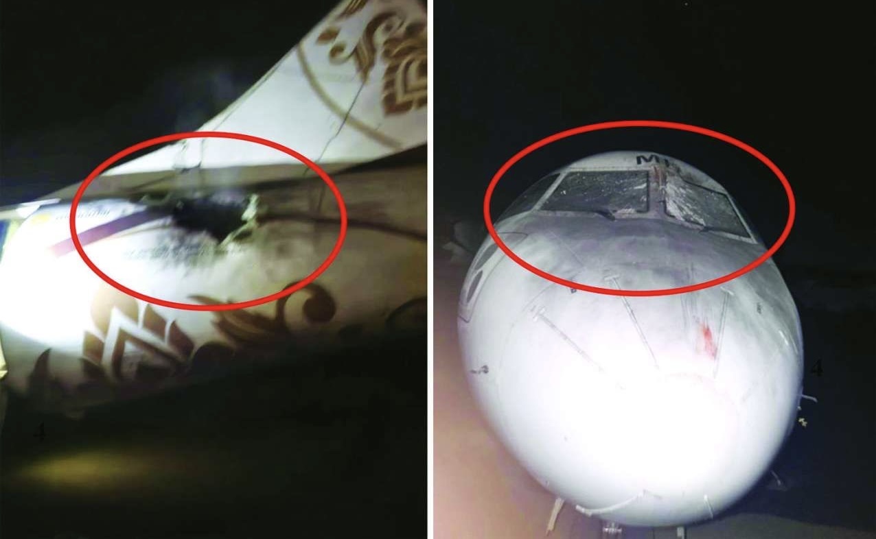 မြစ်ကြီးနားလေဆိပ်ကို KIA က ဒရုန်းနဲ့ တိုက်ခိုက်လို့ ပျက်စီးသွားတဲ့ ခရီးသည်တင်လေယာဉ်ကို တွေ့ရစဉ်