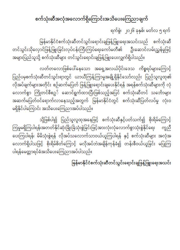 မိမိတို့ အသင်းသည် စက်သုံးဆီ တင်သွင်း သိုလှောင် ဖြန့်ဖြူးခြင်း လုပ်ငန်းကြီးကြပ်ရေးကော်မတီ၏ ဦးဆောင် လမ်းညွှန်မှုဖြင့် အများပြည်သူသို့ စက်သုံးဆီများ တင်သွင်း ရောင်းချဖြန့်ဖြူးပေးလျက်ရှိကြောင်း မြန်မာနိုင်ငံ စက်သုံးဆီတင်သွင်းရောင်းချဖြန့်ဖြူးရေးအသင်းက ထုတ်ပြန်ခဲ့သည်။