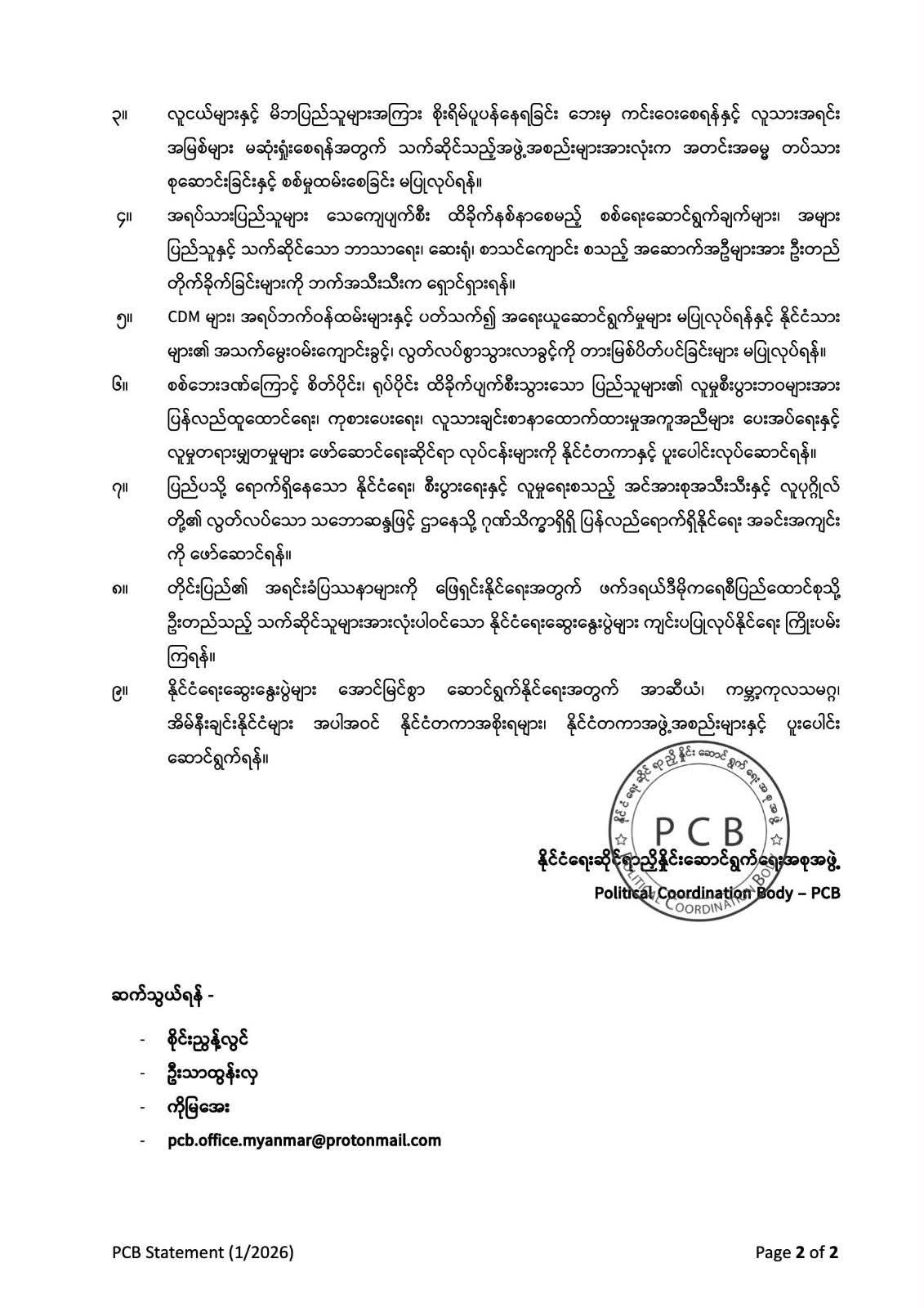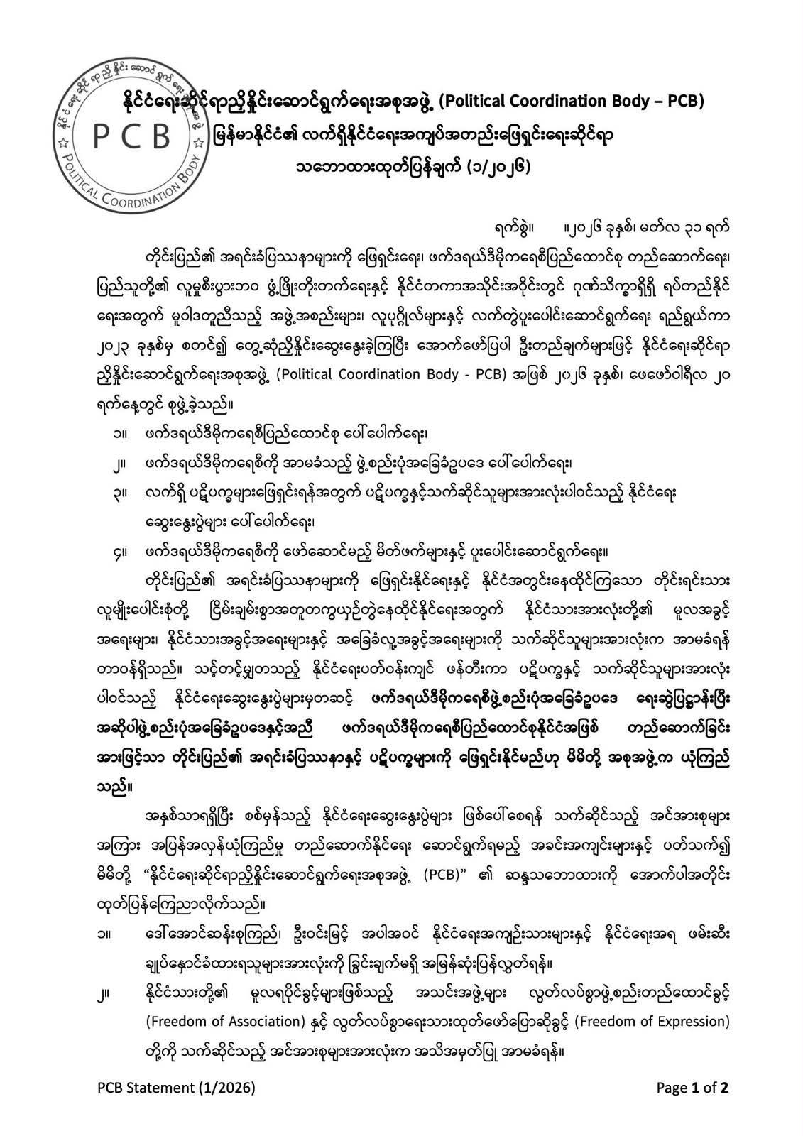 နိုင်ငံရေးဆိုင်ရာ ညှိနှိုင်းဆောင်ရွက်ရေးအစုအဖွဲ့(Political Coordination Body-PCB)၏ ထုတ်ပြန်ချက်ကို တွေ့ရစဉ်