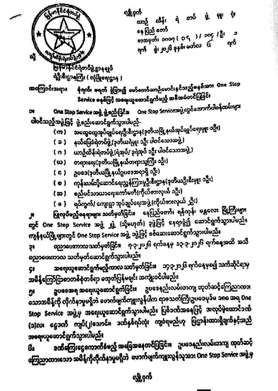 အဆိုပါ အမိန့်စာထဲတွင် (One Stop Service) ဖွဲ့စည်းရာ၌ အထွေထွေအုပ်ချုပ်ရေးဦးစီးဌာန(ဒုတိယ မြို့နယ် အုပ်ချုပ်ရေးမှူး-၁ ဦး)၊ နယ်မြေခံရဲတပ်ဖွဲ့၊ တရားရေးဌာန (ဒုတိယမြို့နယ်တရားသူကြီး- ၁ ဦး)၊ ဥပဒေဌာန( ဒုတိယမြို့နယ်ဥပဒေအရာရှိ- ၁ ဦး)၊ ကုန်းလမ်းပို့ဆောင်ရေးညွှန်ကြားမှုဦးစီးဌာန၊ စည်ပင်သာယာရေးကော်မတီ၊ ရပ်ကွက်/ကျေးရွာ အုပ်ချုပ်ရေးအဖွဲ့မှ ကိုယ်စားလှယ်များ ပါရှိရမည်ဟု သိရသည်။