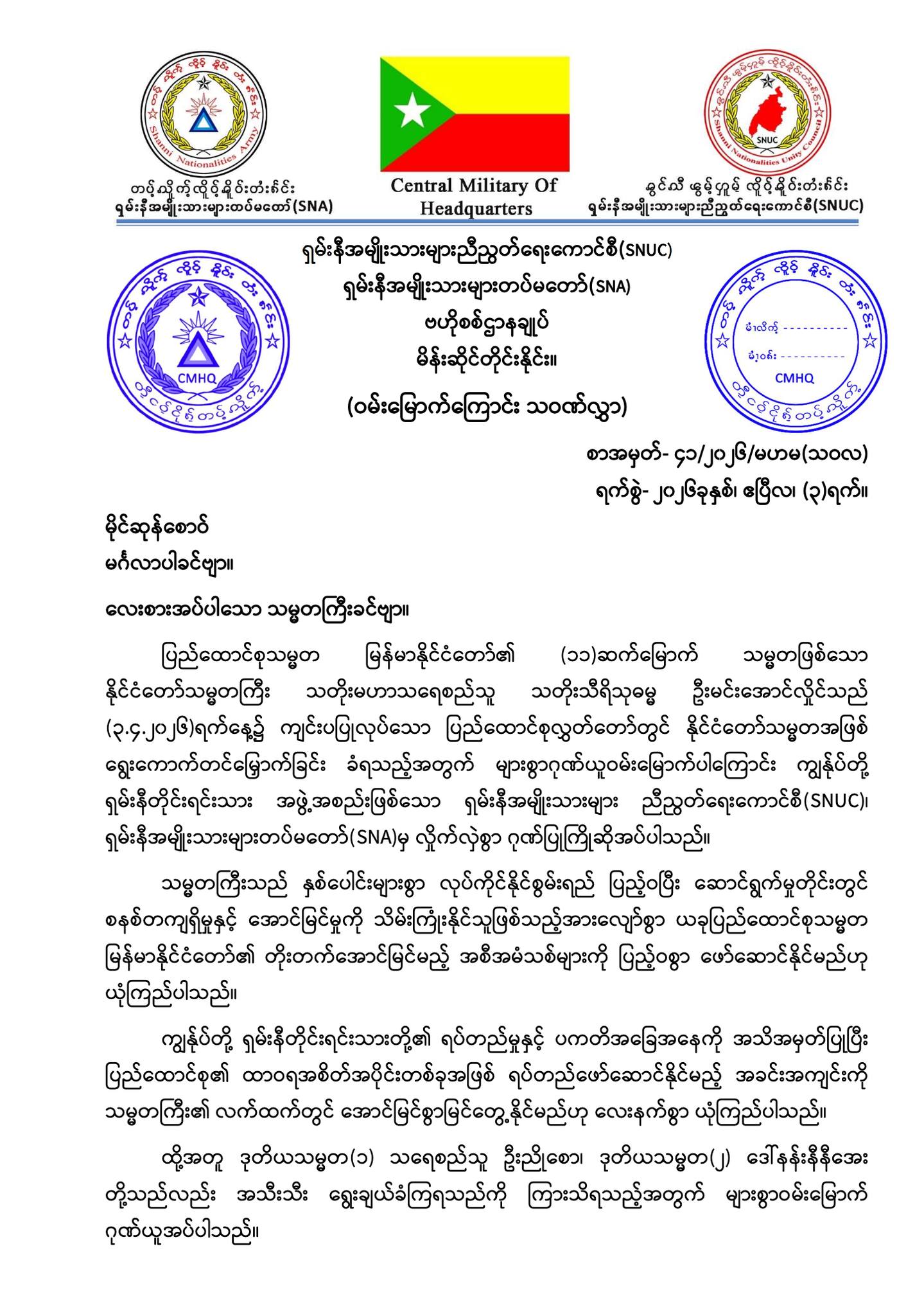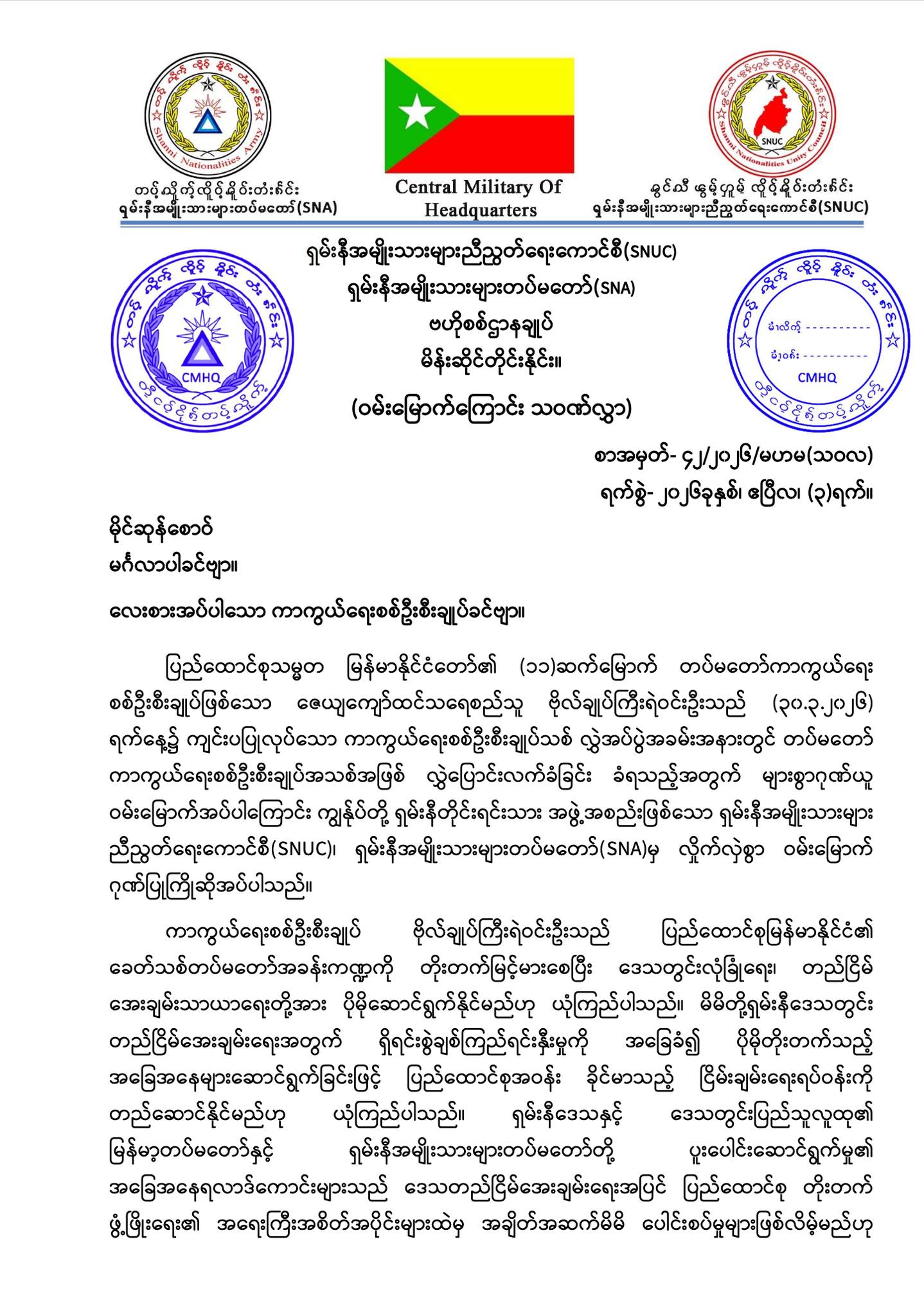 ထို့အတူ ဒုသမ္မတ(၁) ဦးညိုစောနှင့် ဒုသမ္မတ(၂) ဒေါ်နန်းနီနီအေးတို့သည်လည်း အသီးသီး ရွေးချယ်ခံကြရသည်ကို ကြားသိရသည့်အတွက် များစွာ ဝမ်းမြောက် ဂုဏ်ယူအပ်ပါသည်ဟု SNA/SNUC က သဝဏ်လွှာထဲတွင် ပြောကြား ထားသည်။