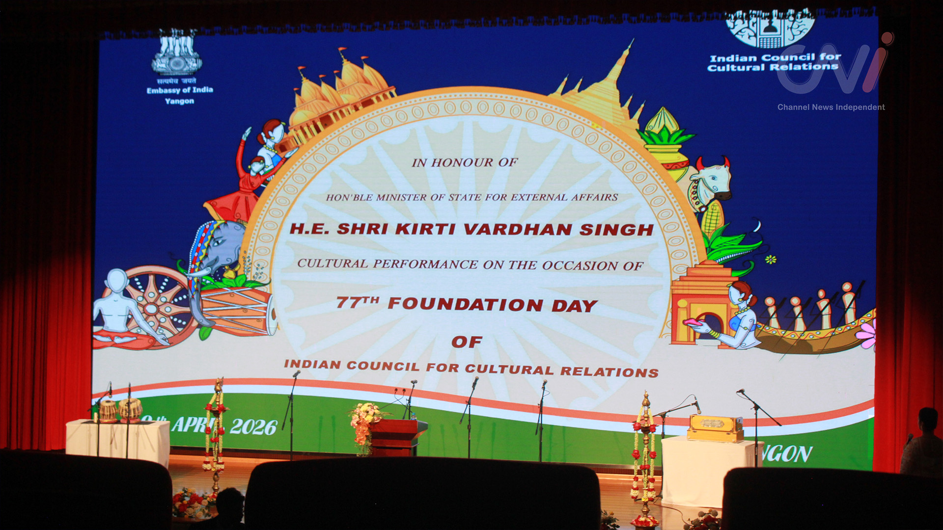 အိန္ဒိယယဥ်ကျေးမှုဆိုင်ရာဆက်ဆံရေးကောင်စီ(ICCR) ၏ (၇၇) နှစ်မြောက် နှစ်ပတ်လည် အခမ်းအနားကို ၂၀၂၆ခုနှစ်၊ ဧပြီလ ၉ ရက်တွင် မြ၀တီမီဒီယာစင်တာ၌ ကျင်းပပြုလုပ်ခဲ့သည်။