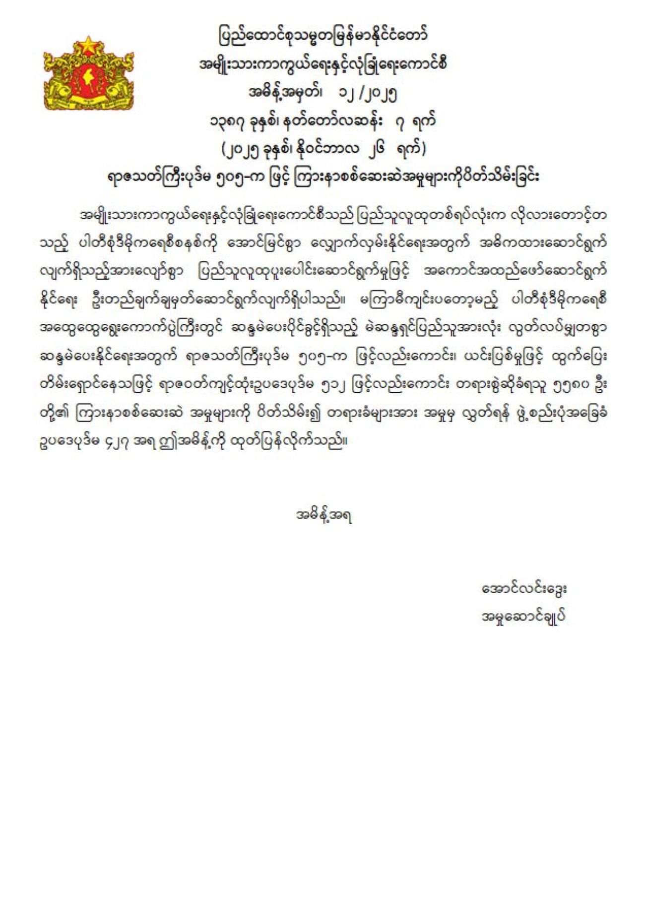 CNI News ၂၀၂၅ ခုနှစ်၊ နိုဝင်ဘာ ၂၆ ရာဇသတ်ကြီး ပုဒ်မ ၅၀၅(က) အရ ပြစ်မှု ထင်ရှားစီရင်ခံရပြီး အကျဉ်းထောင်/အချုပ်ထောင်/ အကျဉ်းစခန်း အသီးသီးတွင် ပြစ်ဒဏ်ကျခံလျက်ရှိသော အကျဉ်းသား/အကျဉ်းသူ ၂၃၆၁ ဦးကို ယင်းတို့ကျ...